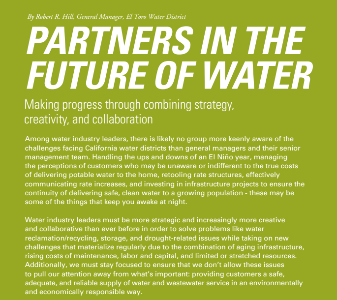Lake Forest, CA — The El Toro Water District received the “District of Distinction” accreditation...
